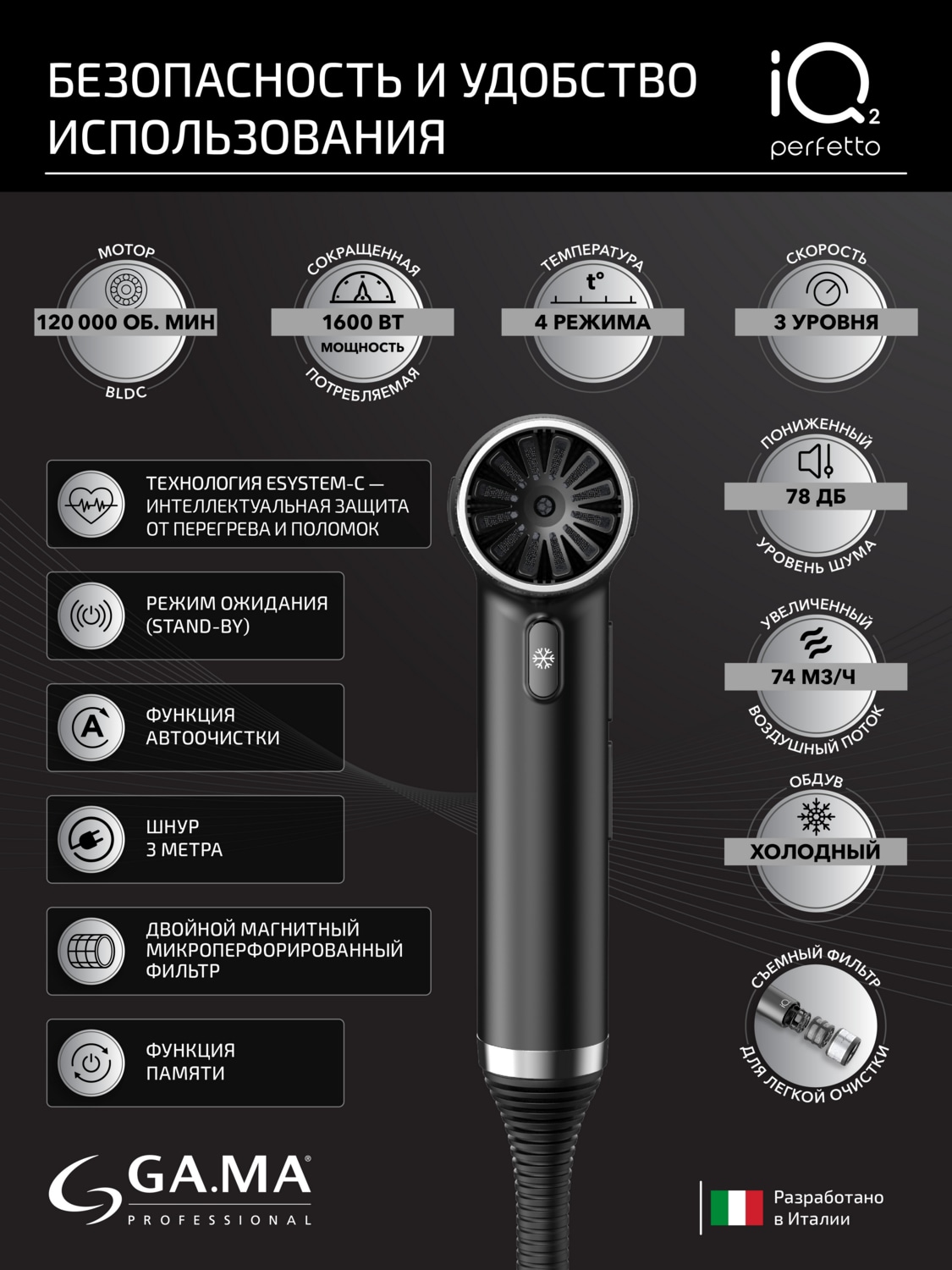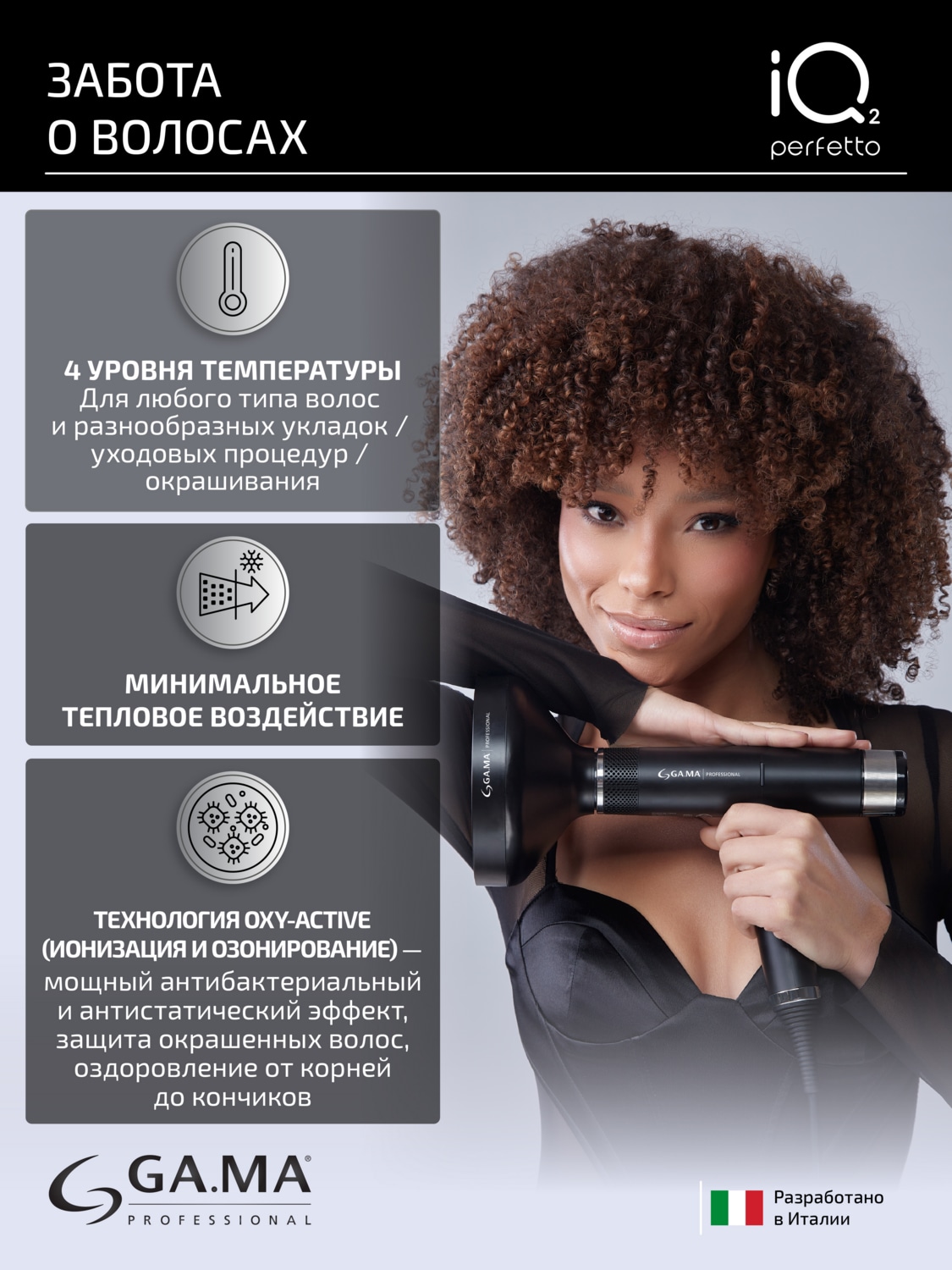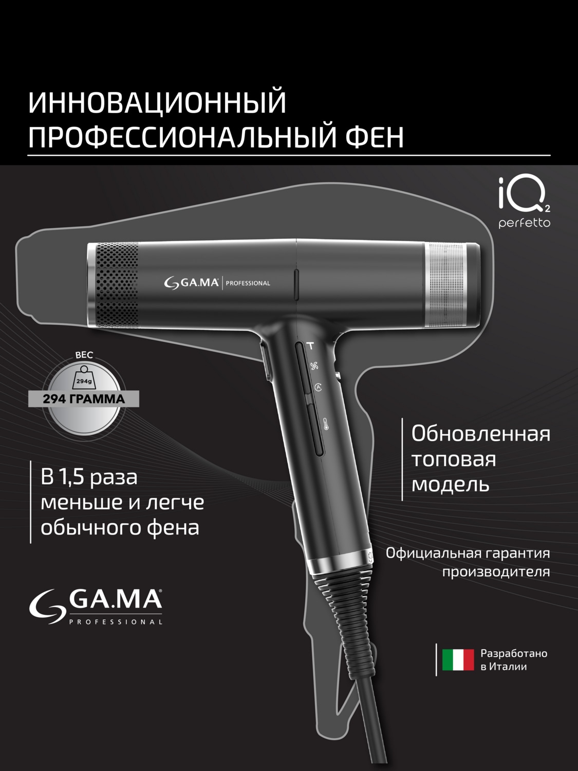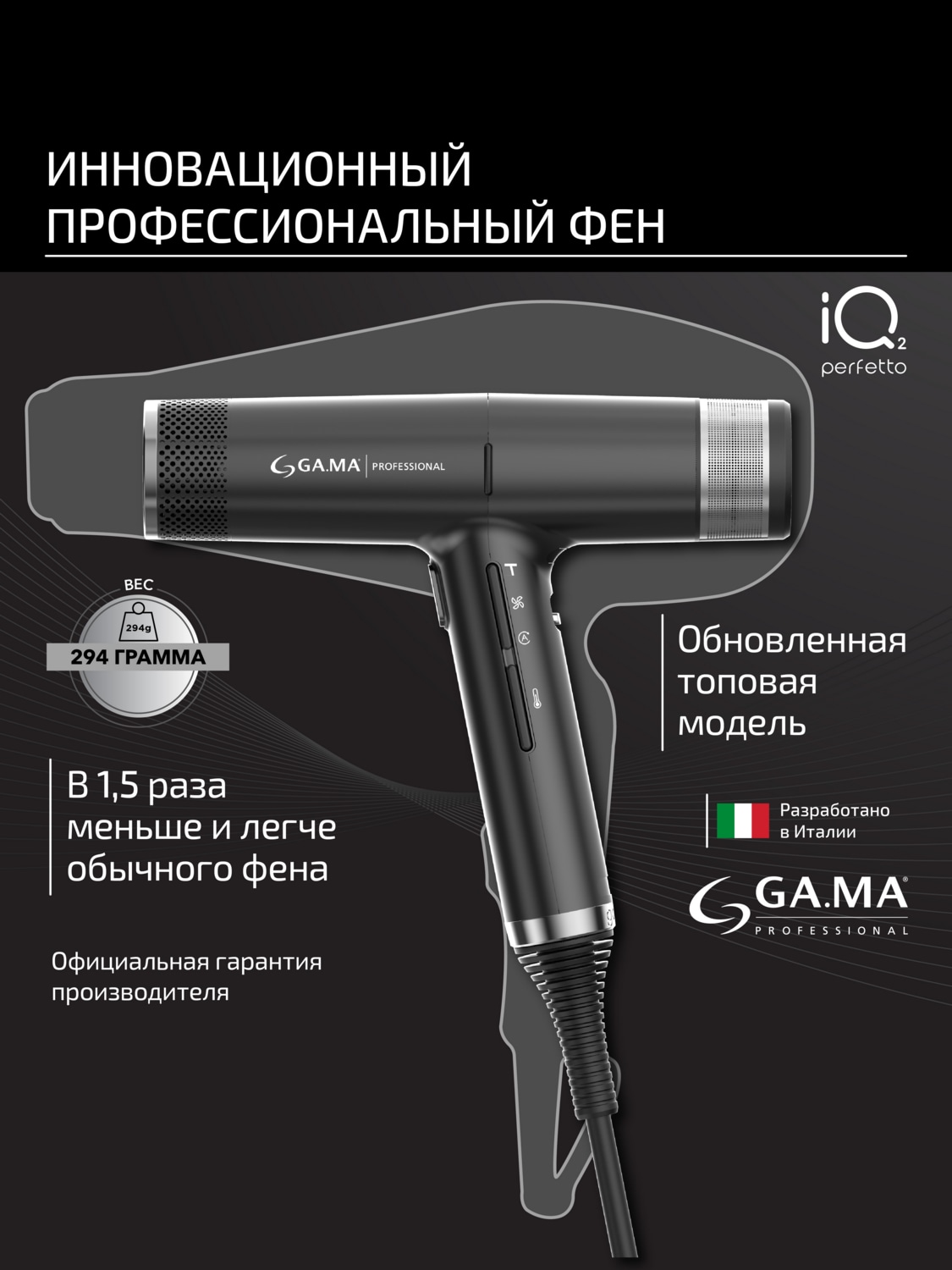 Фен GA.MA IQ2 Perfetto – самый лёгкий профессиональный фен, он весит всего 294 грамма, сушит волосы на 30% быстрее и имеет более длительный срок службы. Это прибор, о котором всегда мечтали стилисты.