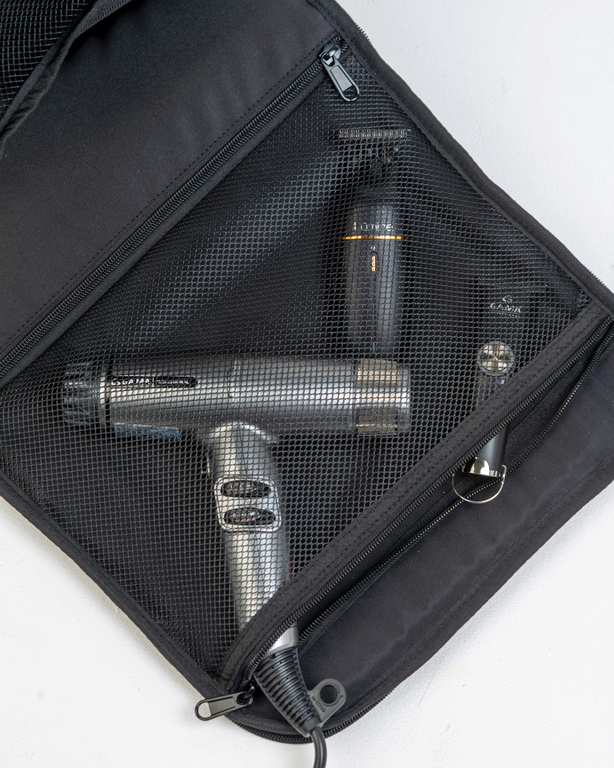 Функциональный и вместительный премиум рюкзак из водоотталкивающей ткани для профессионалов позволит вам структурировано разложить все необходимые инструменты и аксессуары в наиболее удобном порядке, чтобы все было под рукой. Он имеет 2 больших отделения во всю высоту рюкзака. В обоих отделениях вы найдете по 2 кармана на молнии, один из которых сетчатый, а также большое отделение на противоположной стороне с сетчатой крышкой для лучшего обзора, один из которых оснащен фиксирующей резинкой внутри. В этих небольших карманах на молнии для хранения вы можете разместить более мелкие аксессуары (расчески, лезвия, ножницы). Также есть внешний карман на молнии для быстрого доступа к мелким вещам и документам. Для удобства переноски есть мягкие ручки сбоку и сверху рюкзака, а на спинке дополнительная петля для подвешивания на крючок, а также стропа для крепления его на ручку чемодана.