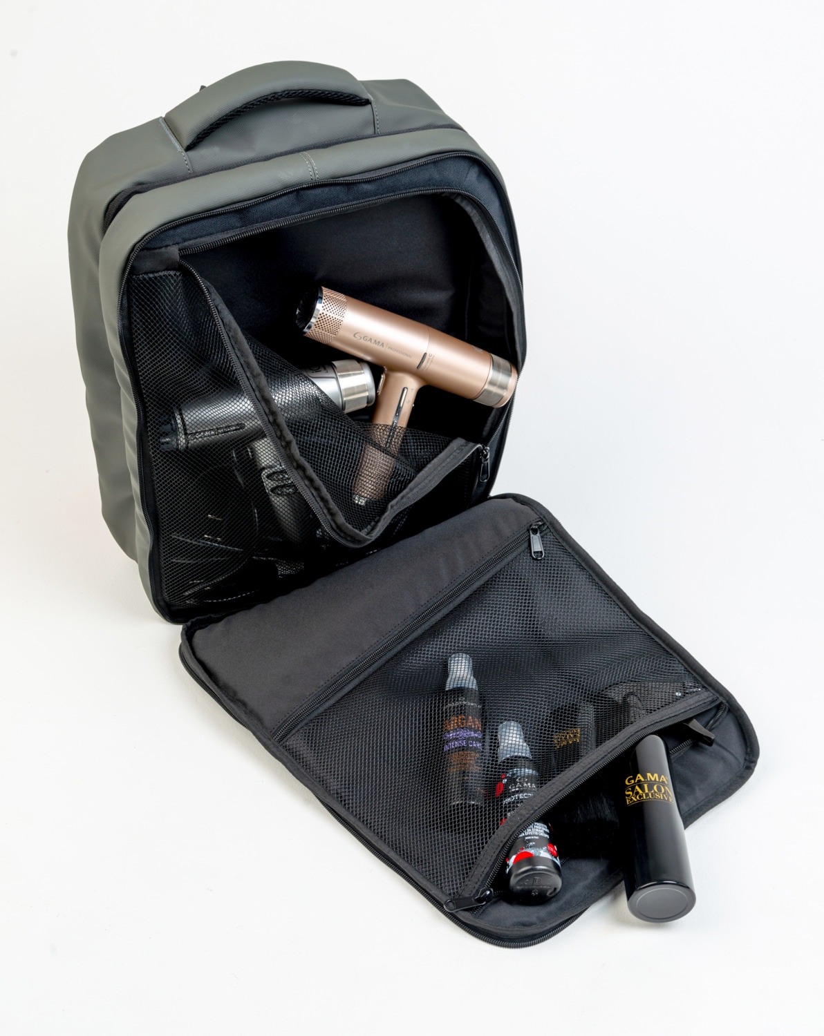 Продуманный большой премиум рюкзак GA.MA из водоотталкивающей ткани со множеством отсеков для размещения инструментов и косметики для стилистов и барберов. Идеально для работы на выездах и в путешествиях.