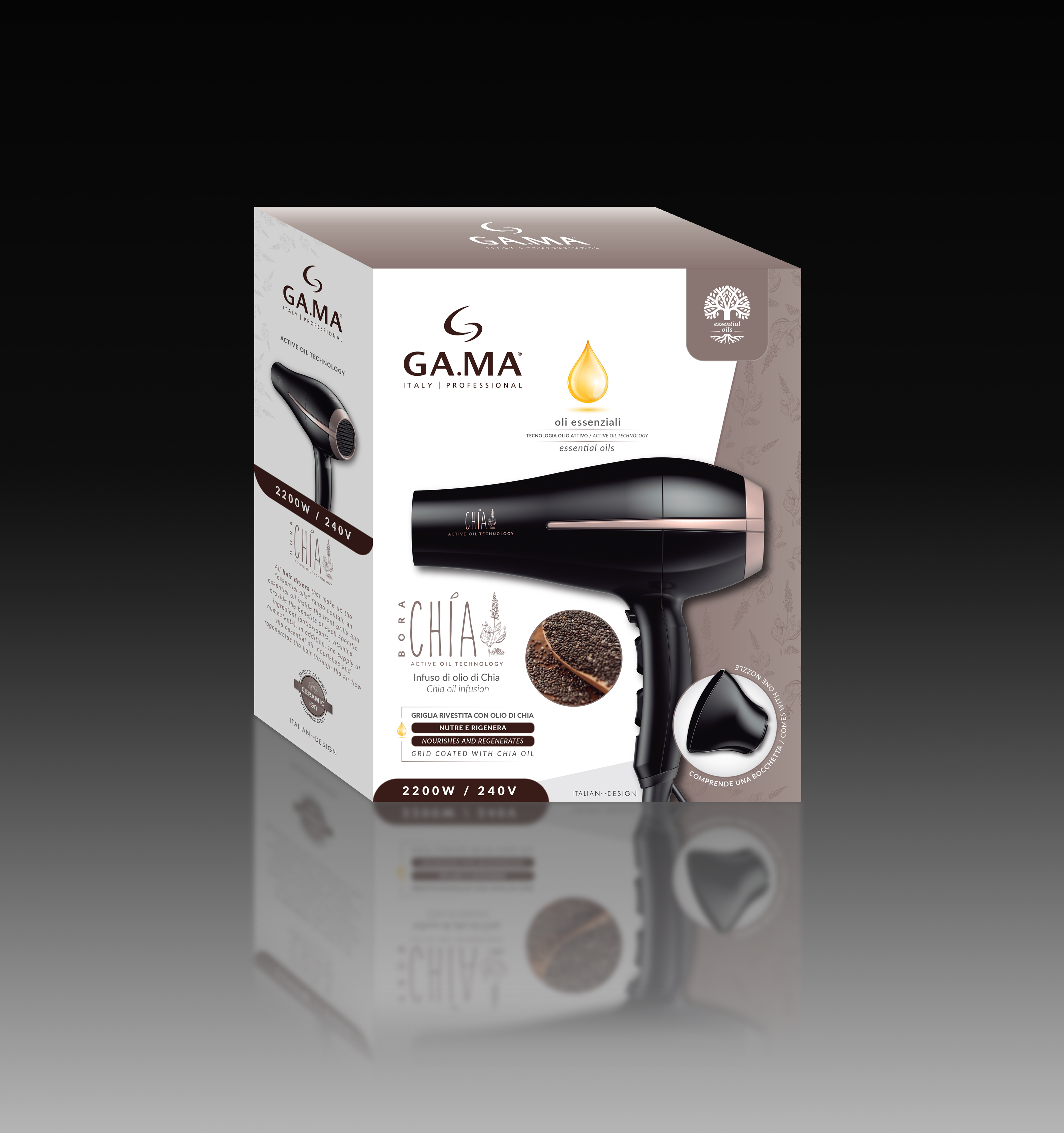 В инструментах серии BORA CHIA используются особые питательные вещества эфирного масла чиа, семена которого содержат витамин С, белок и незаменимые жирные кислоты, особенно Омега-3. Передняя решетка фена покрыта маслом семян чиа, при нагреве которого волосам передается большое количество полезных микроэлементов. Действие масла восстанавливает поврежденные пряди, сохраняя кончики здоровыми и блестящими.