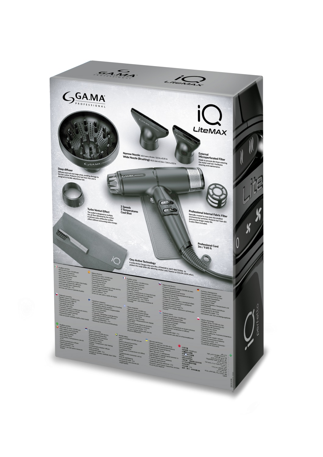 Мощный и легкий фен iQ Lite Max серии Perfetto предназначен для профессионального использования. Он оснащен инновационными технологиями такими, как Oxy-Active (активный кислород) - снимает статику с волос и оказывает мощный антибактериальный эффект, а также System-C, предотвращающей перегрев фена.