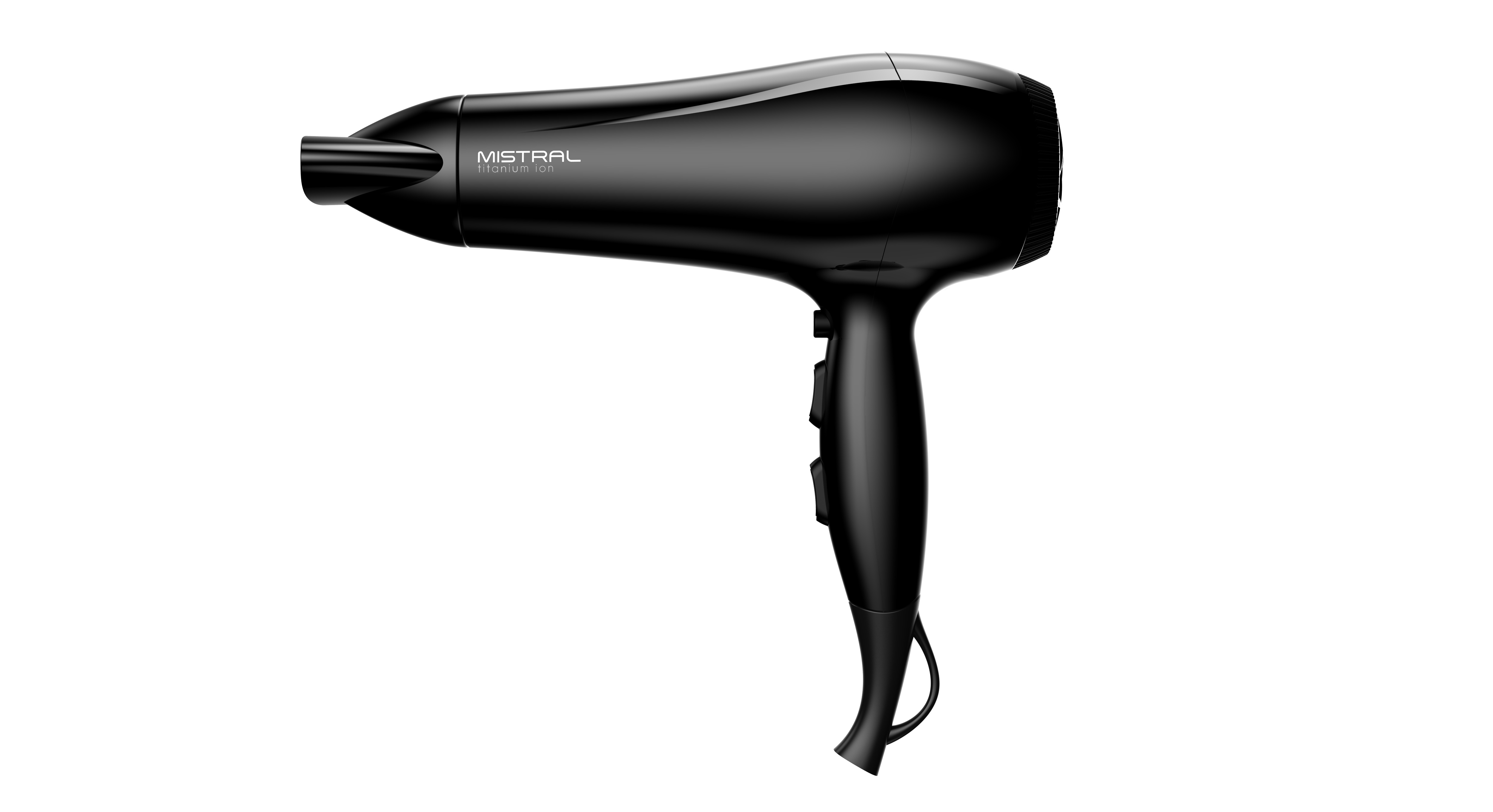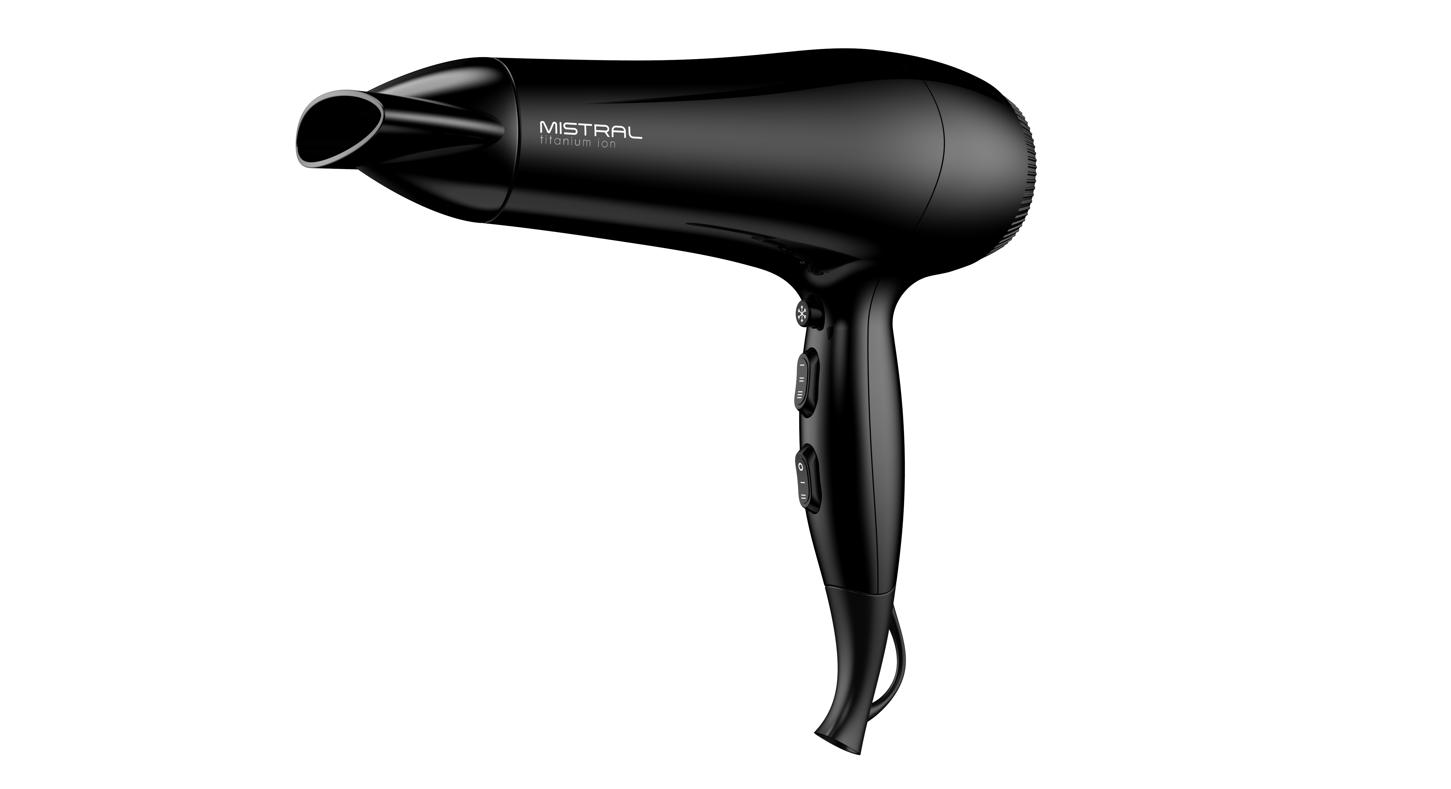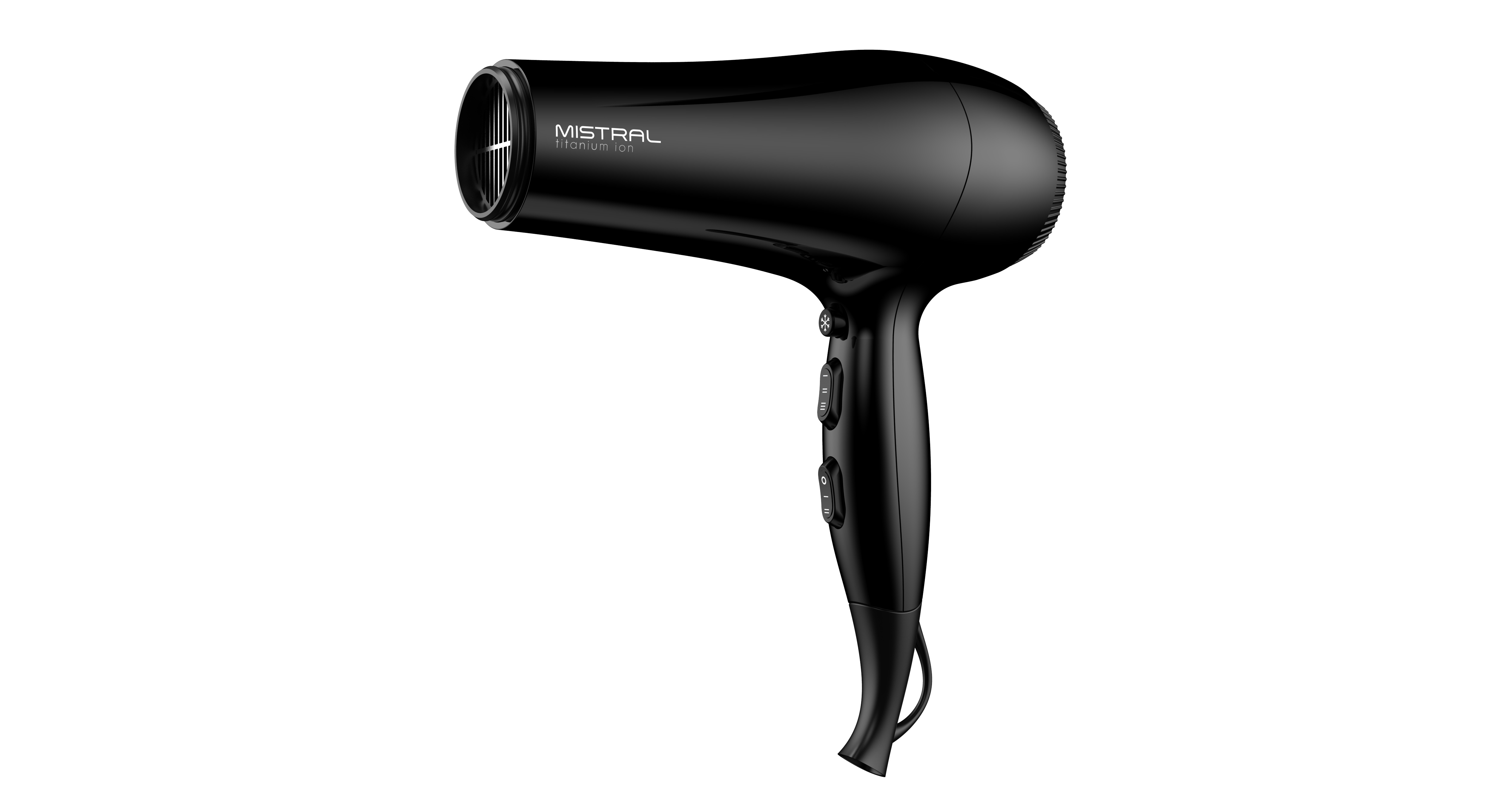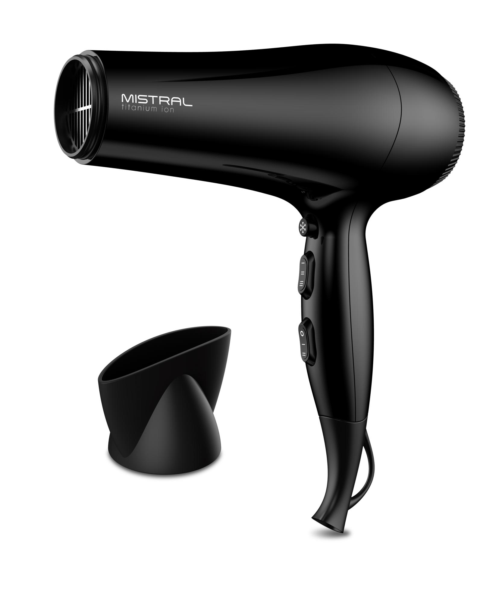 Легкий фен для волос Mistral Titanium Ion с мощностью 2200 Вт и DC мотором выполнен в классическом черном цвете. Кнопки управления расположены на рукоятке, фен удобно лежит в руке, имеет небольшой вес всего 405 грамм. У него 6 режимов работы: 3 температуры и 2 скорости, а также функция холодного обдува, которая помогает закрепить укладку. В комплект входит одна насадка-концентратор шириной 8 см для сушки и укладки на брашинг.
