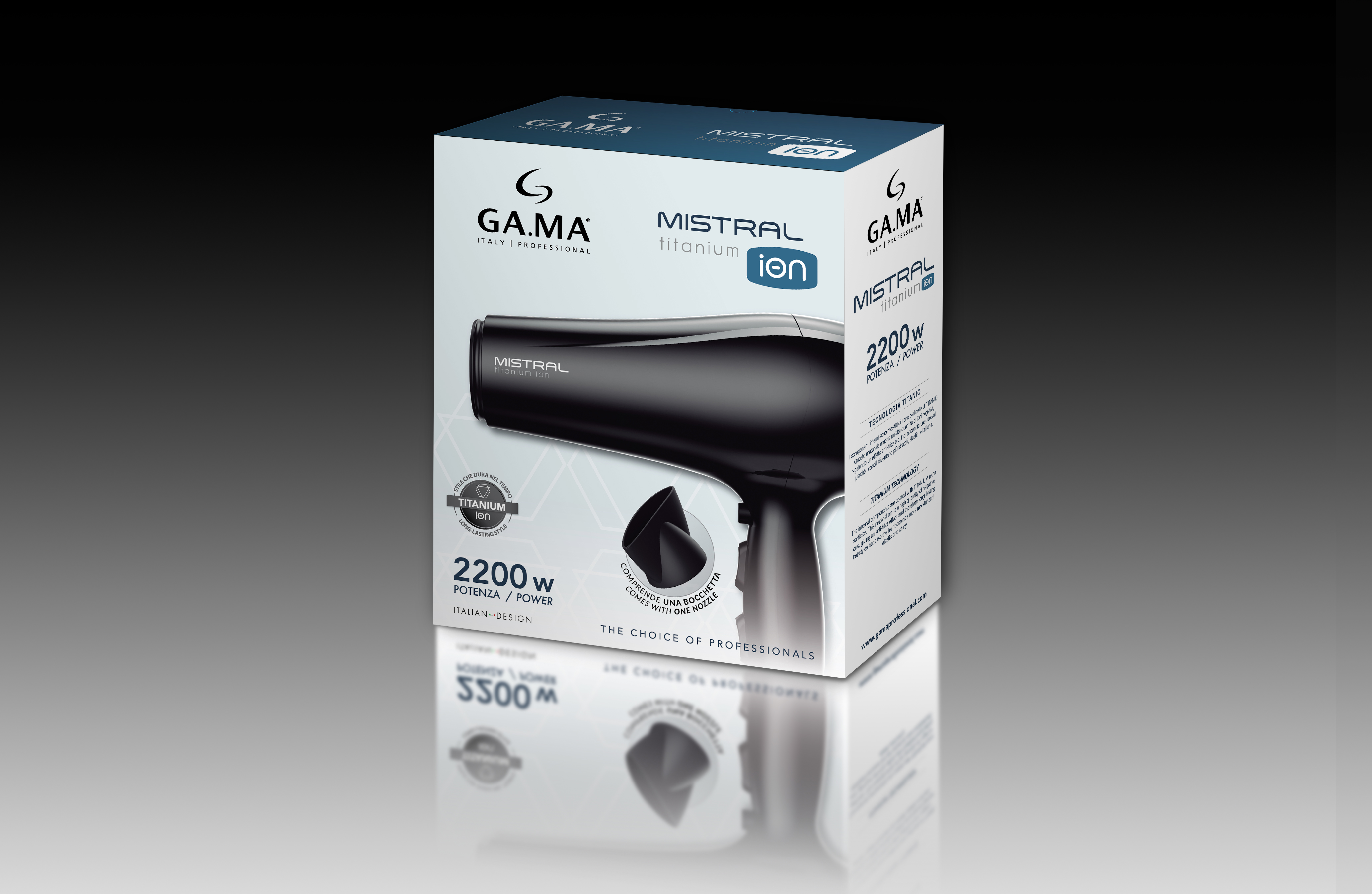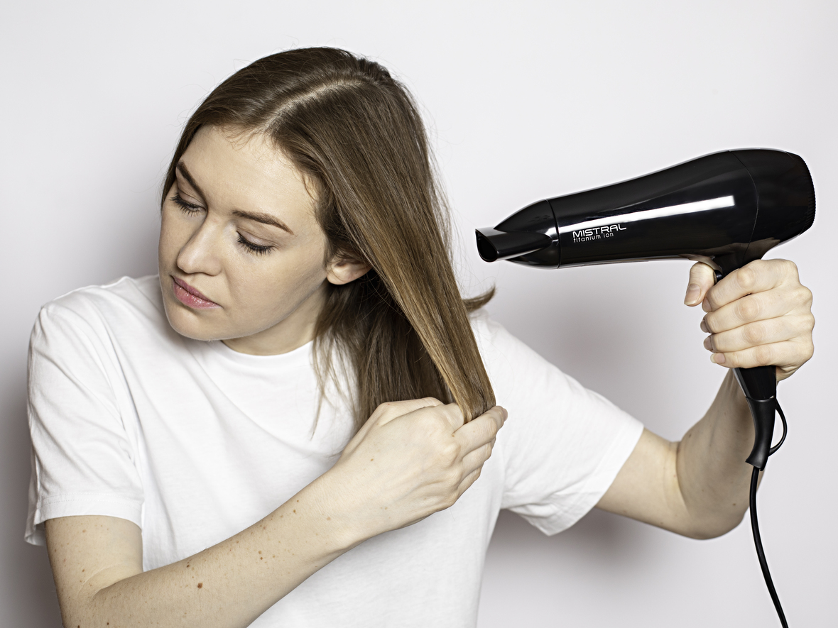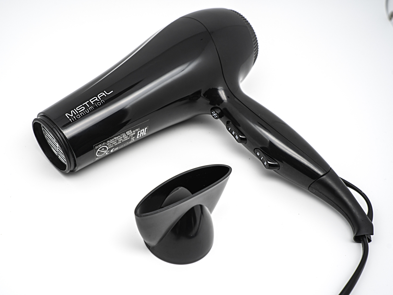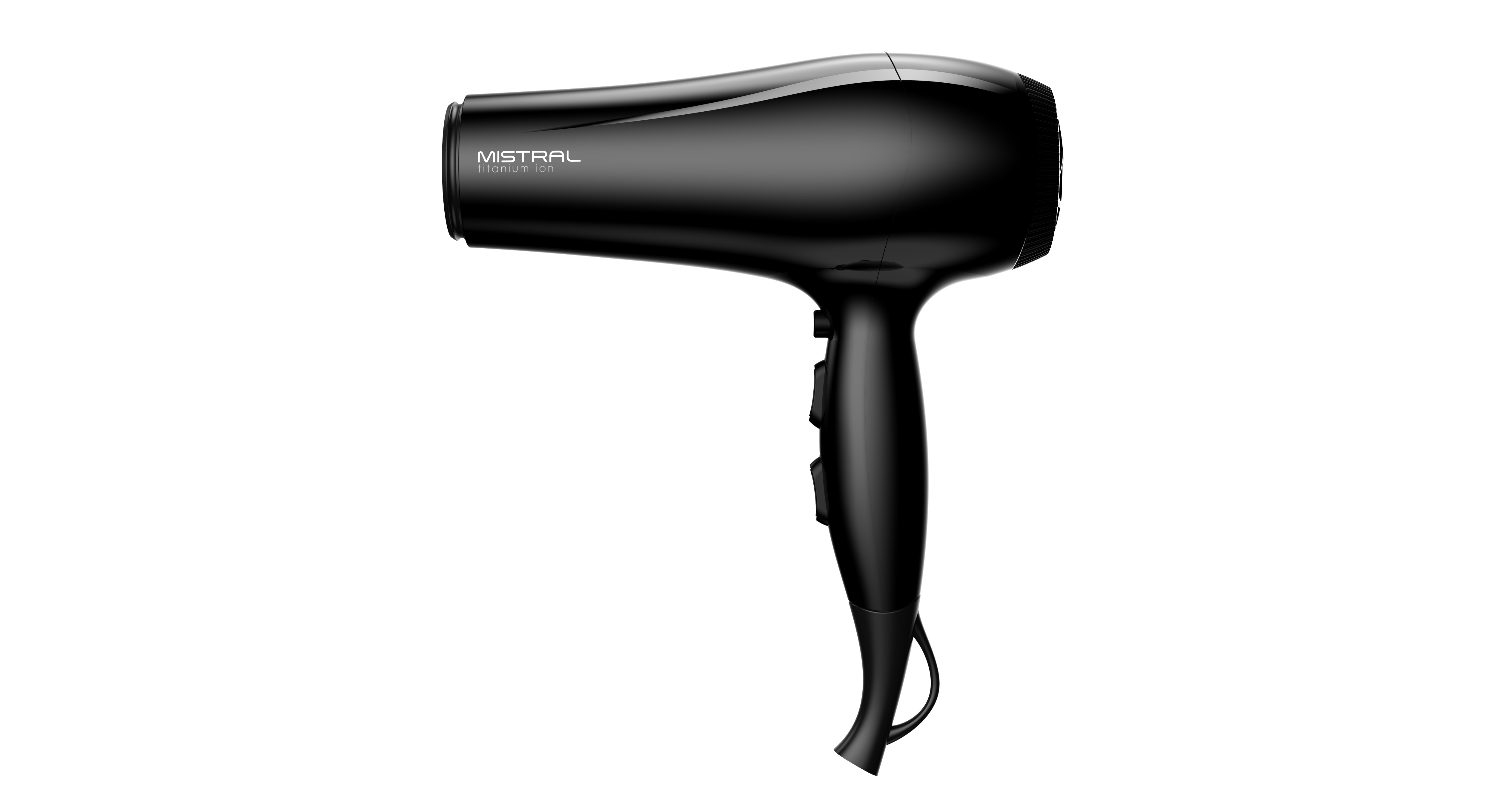 Легкий фен для волос Mistral Titanium Ion с мощностью 2200 Вт и DC мотором выполнен в классическом черном цвете. Кнопки управления расположены на рукоятке, фен удобно лежит в руке, имеет небольшой вес всего 405 грамм. У него 6 режимов работы: 3 температуры и 2 скорости, а также функция холодного обдува, которая помогает закрепить укладку. В комплект входит одна насадка-концентратор шириной 8 см для сушки и укладки на брашинг.