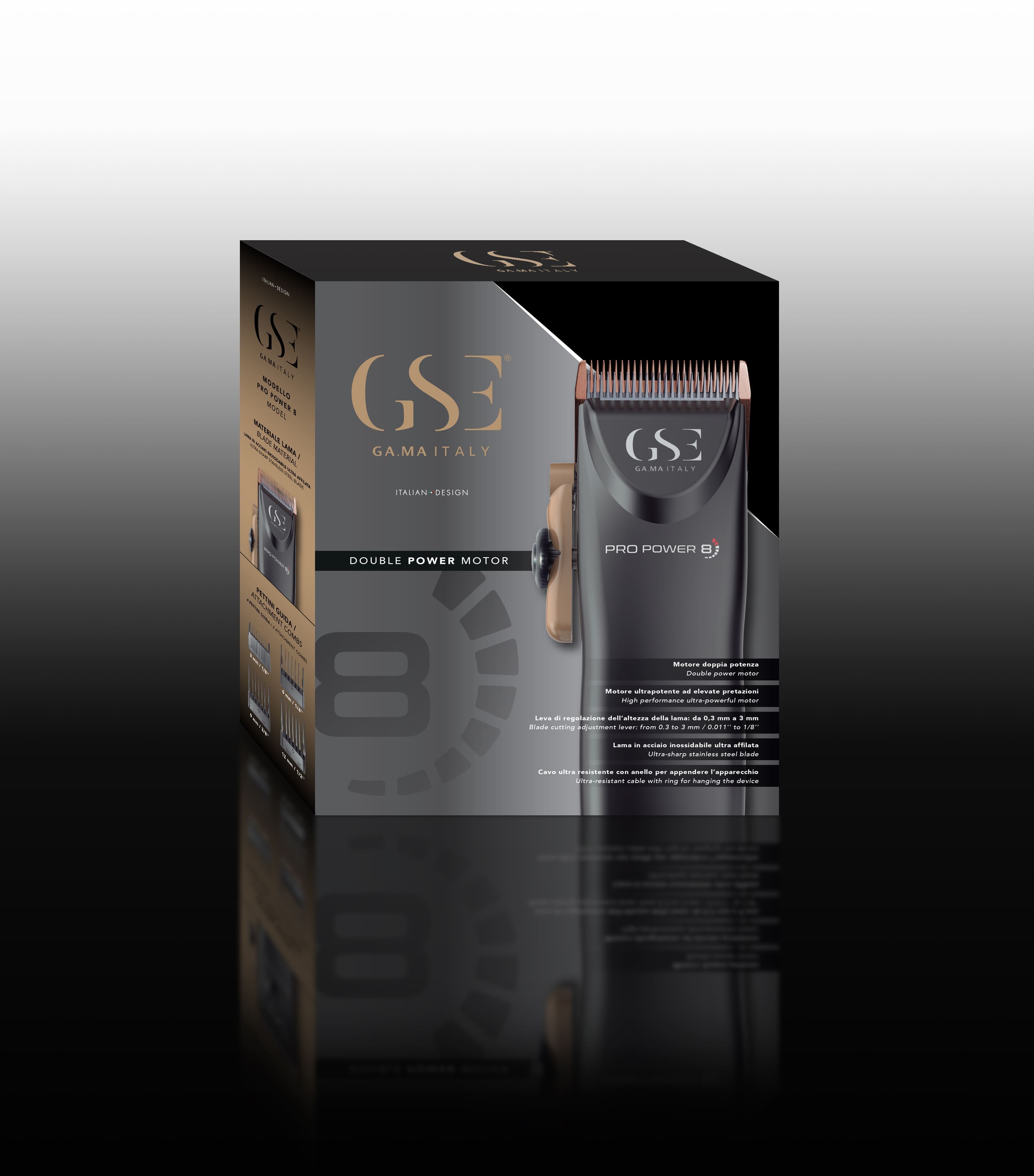 PRO POWER 8 - это машинка для стрижки волос, работающая от сети, оснащенная сверхмощным высокопроизводительным магнитным мотором. Сверхострое лезвие из нержавеющей стали шириной 4 см обеспечивает качественную стрижку и длительный срок службы. С помощью бокового рычага и без использования насадок-гребней высоту лезвия можно регулировать от 0,3 мм до 3 мм. С другой стороны, благодаря 4 направляющим гребням можно получить срез от 3 до 12 мм, обеспечивая тем самым широкий выбор вида стрижки.