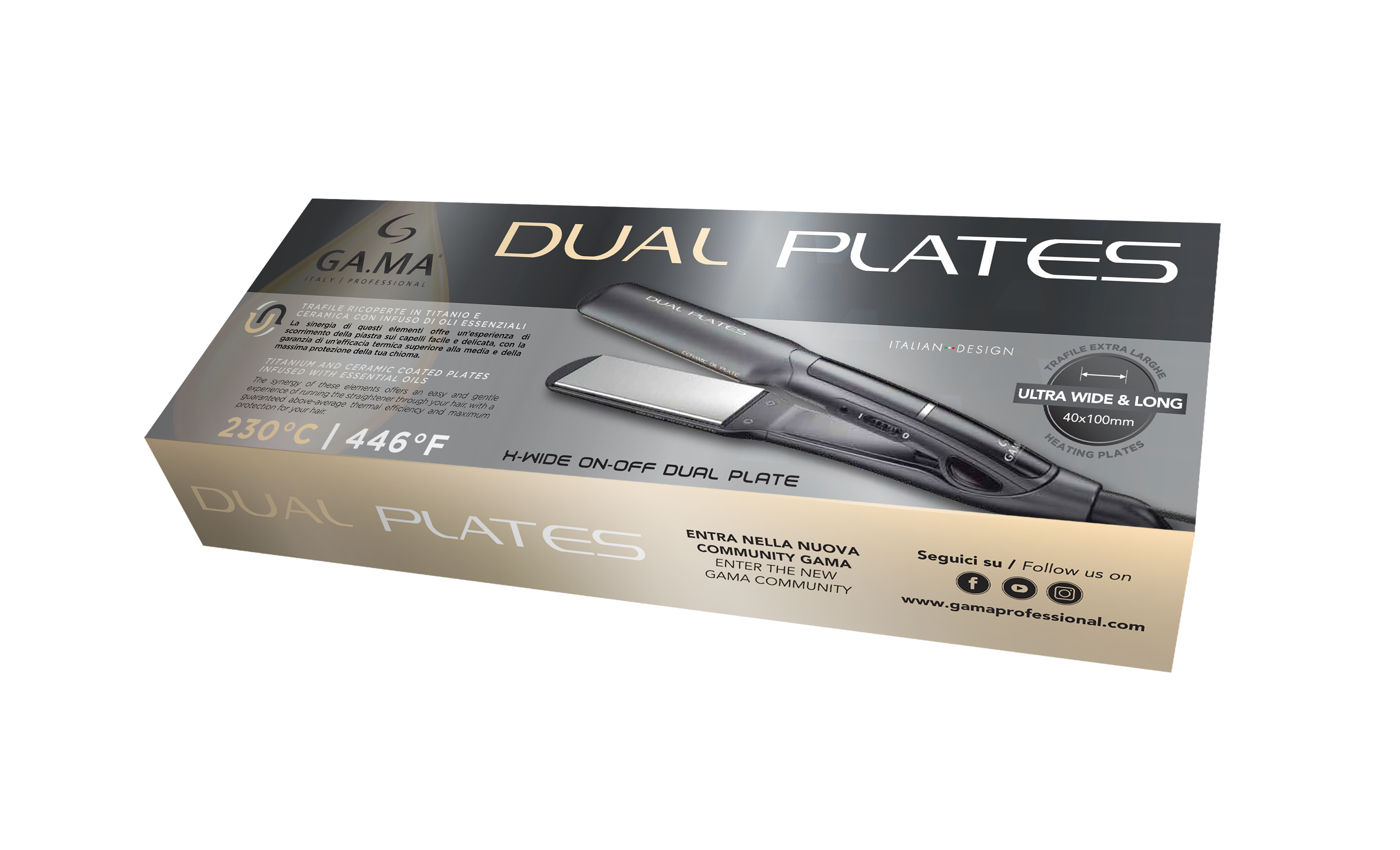 Выпрямитель GA.MA X - WIDE ON-OFF DUAL PLATES оснащен экстраширокими плавающими пластинами 4 х 10 см с комбинированным покрытием. Одна пластина покрыта полированным титаном, другая - керамикой, пропитанной эфирными маслами. Титан является отличным проводником тепла, которое остается постоянным на каждом этапе укладки. Керамика, обогащенная эфирными маслами, обеспечивает легкое и нежное скольжение по волосам, глубоко питая волосы и защищая их естественную влагу. Идеально подходит даже для самых густых и объемных волос, так как имеет постоянную температуру 230 °C. Вращающийся на 360 градусов длинный шнур 2,5 метра позволяет спокойно использовать его на больших расстояниях от розетки. Вес прибора всего 244 грамма. Автовольтаж (диапазон напряжения 110-240 В ~) позволяет использовать прибор даже за границей.