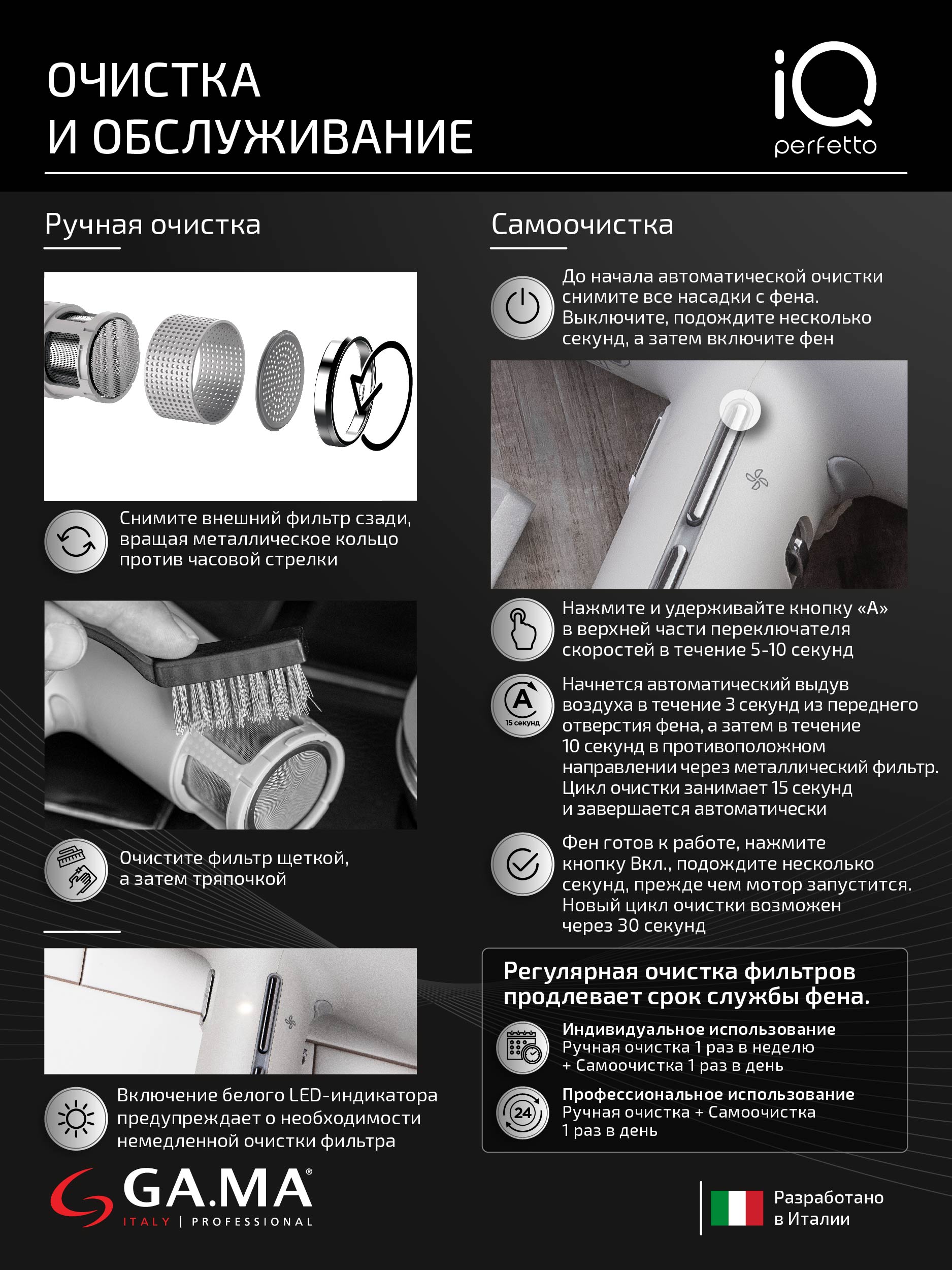 Фен GA.MA IQ Perfetto – самый лёгкий фен с профессиональными технологиями, адаптированный для домашнего использования, он весит всего 294 грамма, сушит волосы на 30% быстрее и имеет более длительный срок службы. Это прибор, о котором всегда мечтали девушки!
